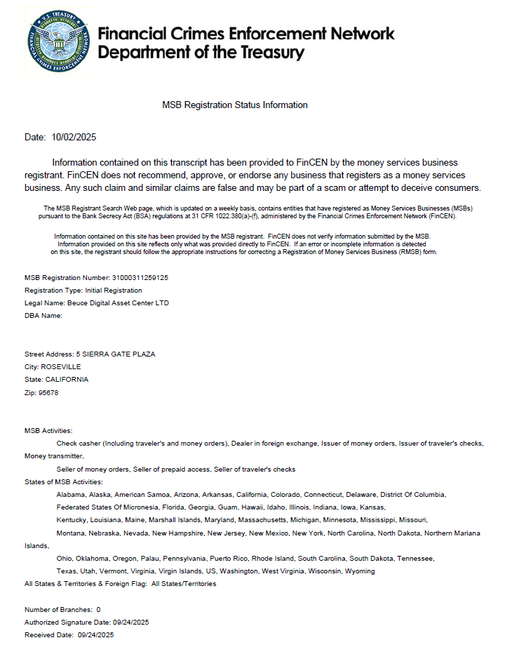 Beuce holds the Money Services Business (MSB) registration with the U.S. Treasury’s FinCEN, allowing it to operate under one of the most rigorous financial compliance standards.