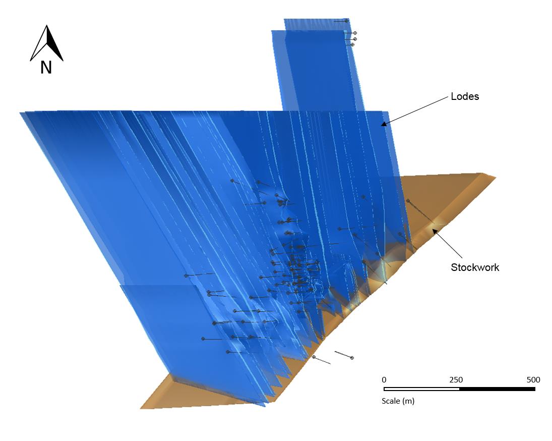 - Two geological domains were determined: The high grade lodes trending roughly N-S and the lower grade stockwork (roughly E-W).