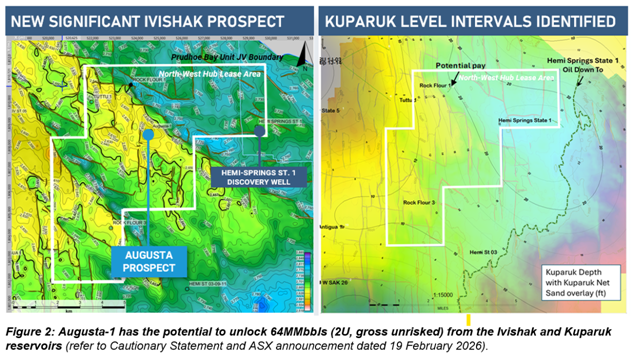 · Augusta-1 is positioned adjacent to existing oil discoveries and producing fields and is designed to test the high‑quality, stacked Ivishak and Kuparuk reservoirs.