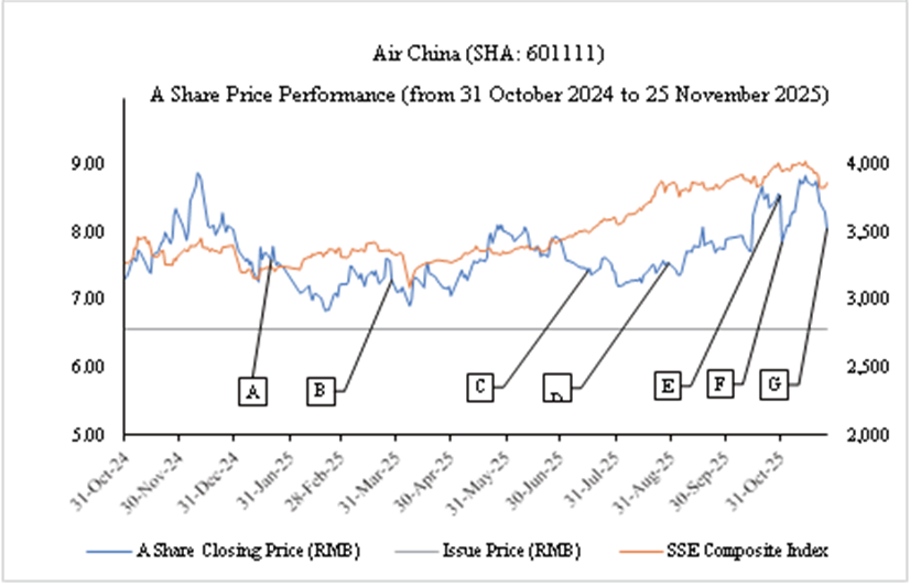 Air China Limited, a company incorporated in the PRC, whose H Shares are listed on the Hong Kong Stock Exchange as its primary listing venue and on the Official List of the UK Listing Authority as its secondary listing venue, and whose A Shares are listed on the Shanghai Stock Exchange. The Company is principally engaged in providing air passenger, air cargo and related services |