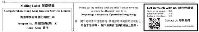 Registered H shares shareholders may at any time choose to receive free of charge the Corporate Communication (Note 2) either in printed form, or read the Website Version, notwithstanding any wishes to the contrary they have previously conveyed to the Company. If you want to receive a printed version of the Current Corporate Communication, please complete, sign and return the Request Form overleaf (which may also be downloaded from the websites mentioned above) to the Company c/o Computershare Hong Kong Investor Services Limited (the "Hong Kong Share Registrar") by post using the mailing label at the bottom of the Request Form (no stamp is needed if posted in Hong Kong). The address of the Hong Kong Share Registrar is 17M Floor, Hopewell Centre, 183 Queen's Road East, Wanchai, Hong Kong. You may also send a scanned copy of the Request Form by email to airchina.ecom@computershare.com.hk.