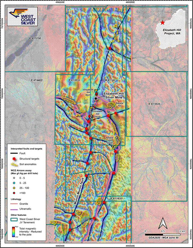 "The results from WCE's detailed drone magnetic survey confirm structures controlling silver mineralisation at Elizabeth Hill extending well beyond the historical mine workings. The results when overlain with previously reported anomalous surface sampling and aircore drilling assays show a pattern of new targets along the Munni Munni fault north and south of Elizabeth Hill, and significantly in new locations not along the Munni Munni fault.