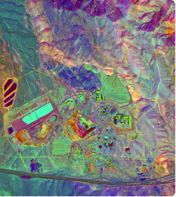 An example of satellite hyperspectral imaging is set out below in the following image showing the ability to detect alteration minerals like Fe-oxides, clays, and carbonates, lithological mapping under vegetation cover, and structural interpretation of fault lines.