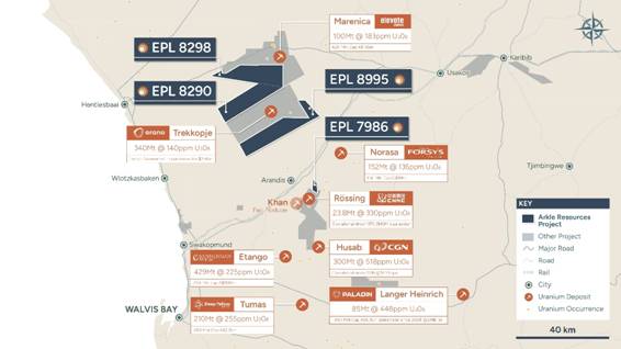 Arkle's EPLs 8995 and 8290 are contiguous to the Trekkopje deposit, one of the most significant calcrete-hosted uranium deposits globally, currently under assessment by Orano for start-up.