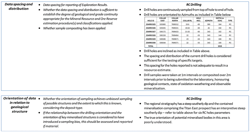 Ten RC holes were drilled in September 2025 to test three priority targets at Titan East (Figure 1). Two of the RC holes intersected a previously untested mineralised structure, interpreted to be a wide north-east trending shear zone beneath shallow cover, with holes 25ARRC006 and 25ARRC024 returning broad intervals of gold mineralisation (Appendix Tables 1-2). Drilling away from the interpreted shear zone returned no significant intersections.