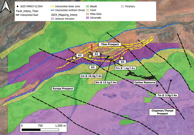 Initial RC drilling earlier this year[2], targeting strong rock-chip samples at surface[3], provided early encouragement that Titan East may host a mineralised structure beneath shallow cover. These results established the area as a credible new target located only 1.5km from the existing Carlow deposit (Inferred Resource 374koz Au and 64kt Cu [4]).