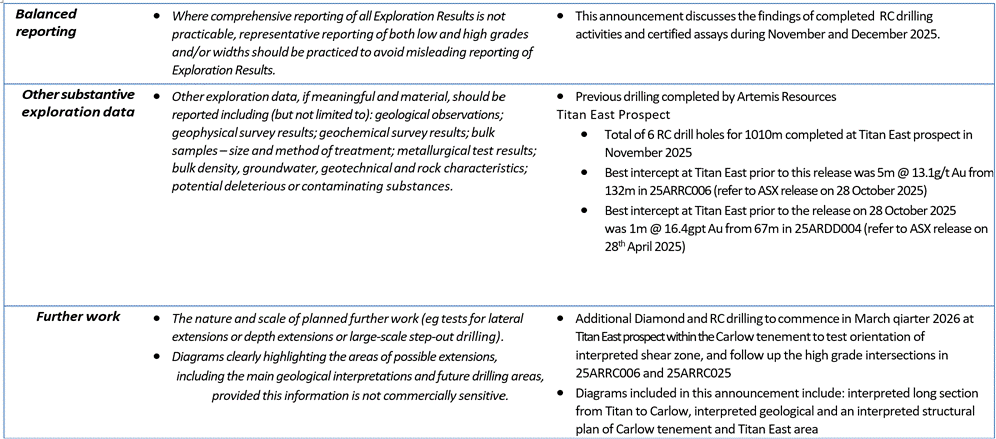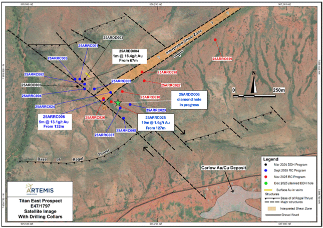 Artemis Resources (ASX: ARV) (Artemis or the Company) is pleased to report that recent work at Titan East has evolved from early encouraging drilling results to a standout high-grade intercept, now complemented by a wide gold intersection, supporting the acceleration of drilling as the Company advances exploration of a newly identified gold zone.