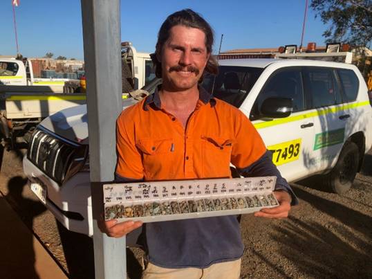 Figure 7: Project Geologist Tony Sheehan with drill chips from 25ARRC025 (140-160m) including veined, altered ultramafic sequence and sediments (Refer Table 3)