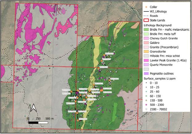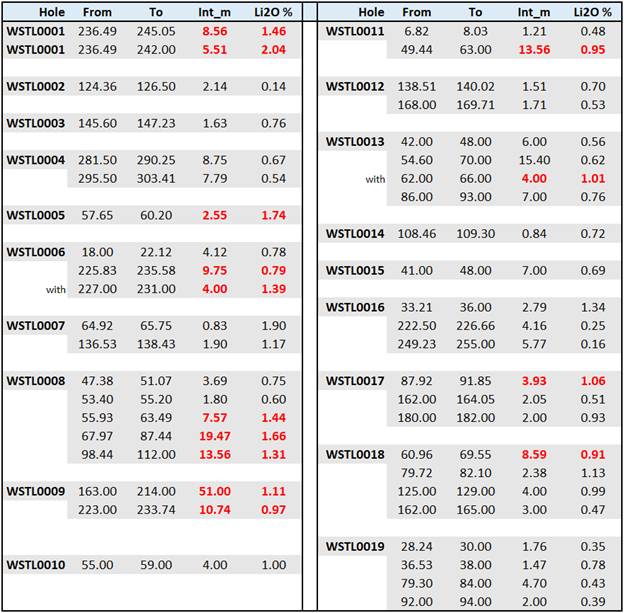 · Additional high-grade intercepts were also recorded such as 5.51 meters at 2.04% Li₂O in WSTL0001, 2.55 meters at 1.74% Li₂O in WSTL0005, 4.00m at 1.39% Li₂O in WSTL0006, 4.00m at 1.01% Li₂O in WSTL0013, 3.93 meters at 1.06% Li₂O in WSTL0017, and 8.59m at 0.91% Li₂O in WSTL0018 (See table 1 below for details);