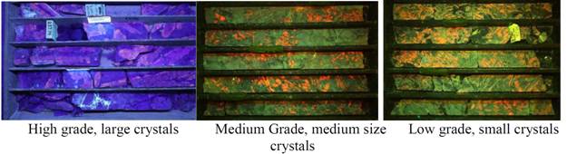Review of the core photos reveal KEX collected ultraviolet light photographs. Higher-grade, coarse-grained spodumene typically fluoresces red-orange under UV light, while lower-grade, finer-grained, quartz-rich spodumene exhibits yellow-green fluorescence (Figure 3).