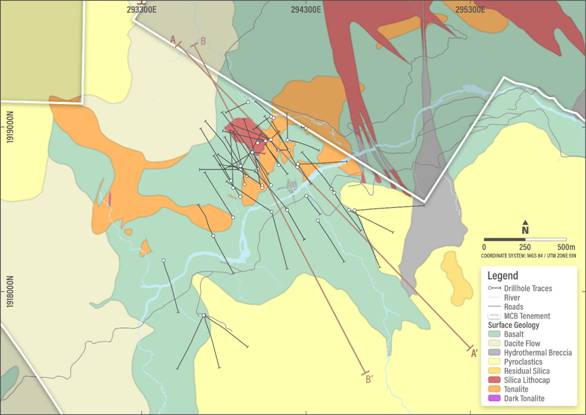Figure 2. MCB Project drill hole locations and interpreted surface geological plan view diagram