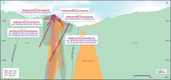 Figure 3. Section 1 with the interpreted host rock geology relative to the defined copper mineralised domains. Drill holes completed after the 2022 Mineral Resource Estimate on this cross section are identified (holes MCB-042, MCB-043, MTPH-001, and MCB-UG-002). View looking Northeast[5].