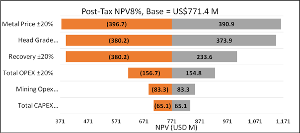 o Post-tax NPV(8%) of US$771 million (~A$1.15 billion) and an IRR of 24% based on conservative copper and gold prices of $4.30/lb Cu and US$3,000/oz Au for 1st 9 years and US$7.0/lb Cu and $US4,500/oz Au thereafter