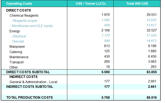 · The capital cost estimate has been prepared to support a Pre-Feasibility Study (PFS) for the Laguna Verde Project, with an effective date of 1 March 2026. The estimate has been developed to align with the disclosure expectations of the JORC Code (2012 Edition) and, where applicable, NI 43-101 style reporting structure, while maintaining consistency with international cost estimation standards. · The estimate includes: • Direct costs (equipment supply, construction and installation labour, bulk materials, construction equipment, and contractor overhead and profit); • Indirect costs (engineering, procurement and construction management support, temporary facilities, commissioning support and related services); • Owner's costs; and • Contingency appropriate to a PFS-level estimate. · Costs explicitly excluded from the estimate include financing costs, interest during construction, escalation beyond the pricing basis, closure and rehabilitation costs, sustaining capital, and foreign exchange impacts. The estimate has been prepared on a full equity basis. · The capital estimate corresponds to an AACE Class 4 level of definition, consistent with a PFS. The expected accuracy range is approximately -30% to +45%, reflecting the current level of engineering maturity. Pricing is based on Q4 2025 US dollar values in constant terms, with no escalation applied. · The operating cost estimate has been prepared at Pre-Feasibility Study (PFS) level, primarily based on Worley's OPEX Report. The estimate integrates process definitions, mass balances, and reagent and consumable consumption data provided by CTL and Lanshen, combined with Worley's cost databases and prevailing Chilean and international pricing for labour, energy, reagents, consumables and logistics. · The operating model assumes steady-state production of 15,000 tonnes per annum (tpa) of battery-grade Li₂CO₃, with continuous operation across both the Laguna Verde salar facilities and the Copiapó lithium carbonate plant. The basis assumes approximately 8,000 operating hours per year. · The estimate excludes escalation, financing costs, corporate overhead beyond the Project General Manager level, technology licensing fees, and government royalties (which are incorporated separately in the economic model). · Operating costs are classified into direct and indirect components, consistent with Worley's PFS methodology. |