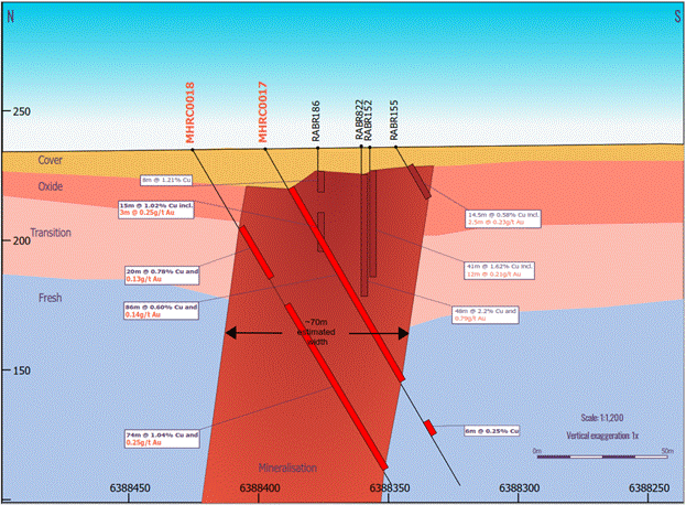 o Mineralisation is expected to extend with depth east of MHRC0018 where historical drilling has intersected shallow oxide mineralisation