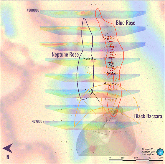 Figure 2. Blue Rose, Neptune Rose and Black Baccara targets with planned drillhole collars