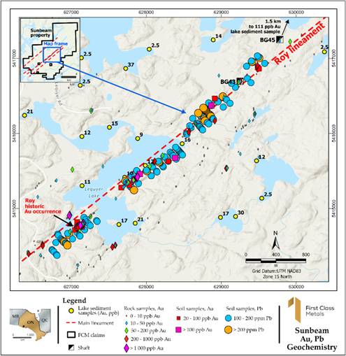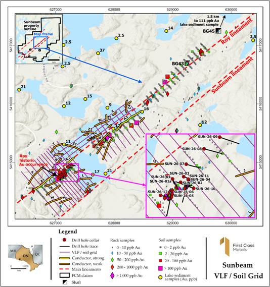 The strike extent of the drilling covers ~300m but the soil sampling (and in part VLF) grid extends over 1,500m to the northwest. A highly anomalous lake sediment sample collect in 2023 containing 111ppb Au is a further 1,500m along strike from the end of the soil grid. There is also a string of grab samples along strike to the southwest with a +1ppm samples 5 km along strike. All these factors continue to build up the expectation of a +10km mineralised structure. The Roy lineament is one of three structures on the Sunbeam property with proven gold occurrences.