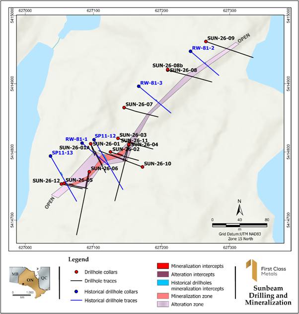 First Class Metals PLC ("First Class Metals", "FCM" or the "Company") the UK listed company focused on the discovery of economic metal deposits across its exploration properties in Ontario, Canada, is pleased to report initial drill results for holes 1-4 and provisionals for holes 5 and 6 from the drilling at the Roy prospect on the Sunbeam Property.
