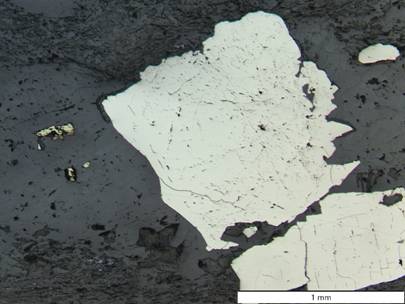 Figure 4 the reflected light photo of gold blebs, (central left of field of view), in the strain shadow of pyrite in high resolution
