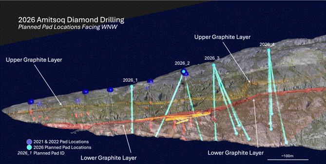 Figure 1, Amitsoq graphite deposit looking west-northwest, showing the planned four drill pads 2026-1 to 2026-4 and the planned up to 12 drill holes in light blue and the Phase I and II drill pads in dark blue. Also shown are the traces of the Lower Graphite Layer orebody (red) and Upper Graphite Layer orebody (yellow) as well as the trace of the underground historical mine workings (light yellow).