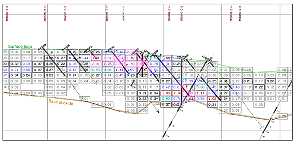 Figure 5: Simplified geological section through the Akoko North resource area showing the outline of the mineralization within the oxide zone.