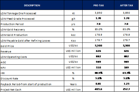 CAA has assumed a starting capex cost of US$50 million for an open-pit heap leach operation with an annual throughput of 550,000 tons. Assumptions are made on the gold recovery (85%) and gold price (US$3,500) which Hamak deems reasonable. The key economic indicators are show in Figure 9.
