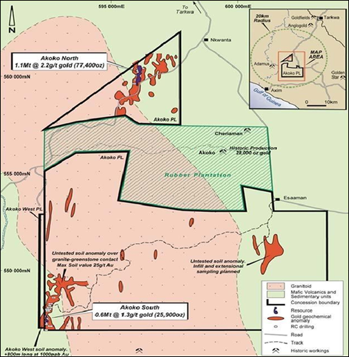 More recent work from 2007, including by Topago, has defined two separate resources at Akoko North and Akoko South totalling 276,500 ounces at a grade of 1.6g/t gold (0.2g/t cut-off). However there remains significant exploration potential to the north, south and east of these resources, as evidenced by extensive, untested gold in soil geochemical anomalies (Figure 3).