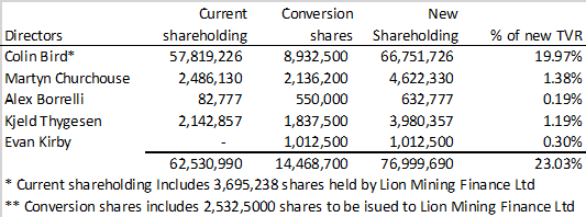 Of the £350,624 of accrued fees owed £289,374 are due to Directors and Lion Mining Finance Ltd a company controlled by Chairman Colin Bird and are being settled by the issue of a total of 14,468,700 Conversion Shares and £61,250 of the Accrued Fees were owed to consultants and are being settled by the issue of 8,752,728 Conversion Shares. The total Conversion Shares being issued to the Directors and their related parties equals 4.3% of the enlarged shares in issue following the issue of the Conversion Shares. The table below shows the Directors' shareholdings after the issue of the Conversion Shares