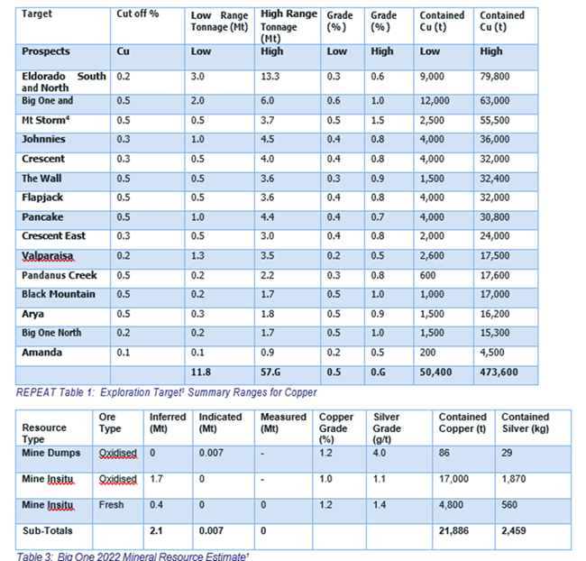 1. Maiden Mineral Resource Estimate 2.1Mt @ 1.1% Cu (21,886t) for Big One Deposit - ASX announcement,