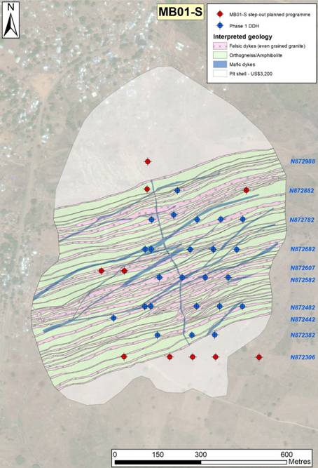 Figure 2. Planned drill collar (in red) map for MB01-S step out programme, with the drill hole collars from Phase 1 drilling (in blue), interpreted geology and the US$3,200/oz gold pit shell of the existing MB01-S MRE, over satellite imagery.