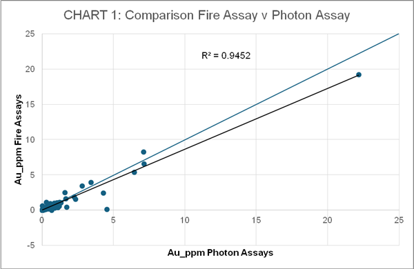 The Company had concern that the potential for nuggety gold may occur in some of the intersections and elected to re-assay the 1m splits using the PhotonAssay method as provided by Intertek in Ghana, the intervals are also provided in Table 1. The method analyses a 500gm split using sample irradiation (reference - PhotonAssay - Chrysos Corporation ) the method involves "hitting samples with high-energy X-rays, Chrysos PhotonAssay™ technology causes excitation of atomic nuclei allowing enhanced analysis of gold, silver, copper and other elements in as little as two minutes". The Company completed a comparison of the analytical methods and found that no significant grade variations occurred (see Chart 1 and Table 1 below).