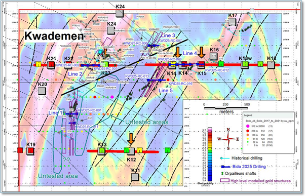 The Kwademen prospect is located on the north-western part of the Bido tenement limits (Figure 1). Panthera Resources started exploration work on the area doing compilation work followed by soil sampling in 2018. The soil sampling program consisted of sampling on east-west lines spaced of 200 m with sampling repeated at 50m interval on each line. An Induced Polarized (IP) survey was conducted in 2023 and consisted of a gradient survey exploring the ground at a relatively constant depth of 50m followed by a Pole-Dipole survey on some selected lines to help determining the depth of the anomalies identified by gradient as long as determining the dip of the chargeable structures. More recently and prior to the finalisation of this proposal for drilling, a program of systematic mapping of all orpailleurs shafts and areas of eluvial workings was completed.