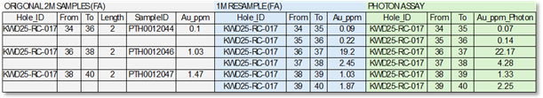 To verify repeatability of the samples collected at 2m intervals the Company collected splits of mineralised zones at 1m intervals. The 1m splits were initially analysed at SGS Laboratory in Ouagadougou by a Fire Assay of a 50g aliquot. This more detailed sampling gave similar results to the original 2m split sampling (Table 1). The exception being for an interval in hole KWD25-RC-017 where resampling at 1 m intervals gave 5m @ 4.95 g/t Au from 35m to 40m and included 36m to 37m @ 19.2 g/t Au. Note original 2m sample split (Fire Assay) from 36m to 38m returned 1.03 g/t Au while re assay by Photon Assay of the 1m interval, 36m to 37m, returned 22.17 g/t Au as shown in table 2 below.