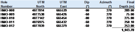 · Diamond drilling to upgrade the Inferred Resource to Indicated status continues smoothly with the completion of hole HMO-012 at 253.80m, being the 5th hole of the resource upgrade campaign.