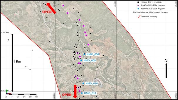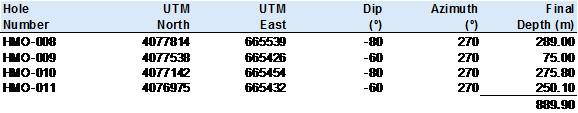 · The fourth drill hole, (HMO-011) has now completed successfully at a total depth of 250.10m and drilling of the next hole has commenced. Hole HMO-011 is a hole drilled in the very south of the resource and confirms that mineralisation continues and remains open towards the south.