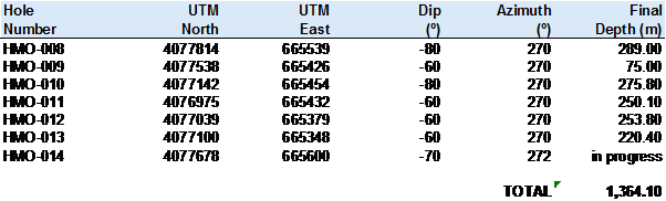· Assay results from hole HMO-011 are awaited and core from hole HMO-012 has been sent to the laboratory.