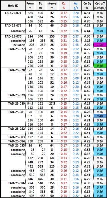 The drilling was designed to improve geological confidence within the interpreted open-pit design and to test mineralisation beyond the current pit limits, including at the Tandayama West target. The results confirm the continuity of copper-gold mineralisation within the northern portion of the interpreted resource shell and identify zones of higher-grade mineralisation at depth, including within intrusive lithologies at the base of the conceptual pit design. Additional mineralised intervals were intersected outside the interpreted pit limits, providing further information to refine the geological model.