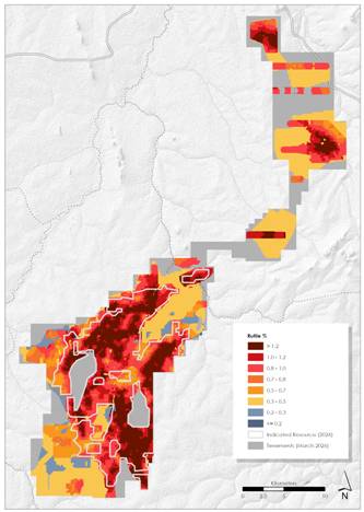 Note: Rutile Mineral Resource defined from a pit shell with mineralisation defined as >= 0.75% Rut95 for the pit shell optimisation run. A rutile concentrate net price of US$1,400 was used to determine economic value. Graphite had no value for this run. The Rutile MRE is reported based on all rutile mineralisation >=0.4% Rut95 within the optimised pit shell. Any apparent differences in totals are due to rounding.