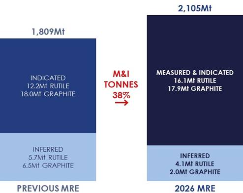 · Total Rutile Mineral Resource increases to 2.1 billion tonnes at 0.96% rutile for 20.3Mt contained rutile with 0.95% TGC for 20.0Mt contained graphite (M,I&I)