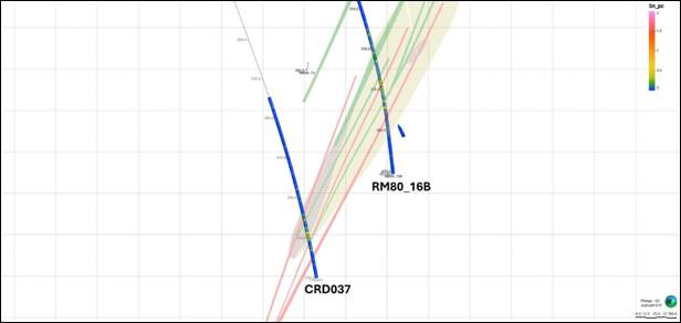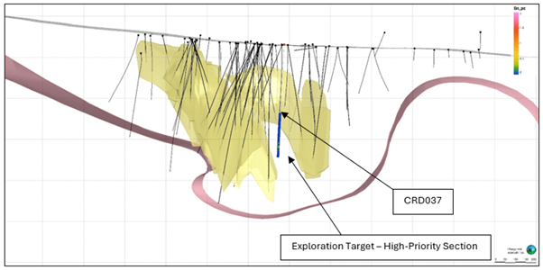Based on results from CRD037, and supporting drillholes, this part of the deposit is expected to be included in the forthcoming MRE, whereas it was previously outside the scope of estimation and classified as an Exploration Target. Any change in classification will be subject to further geological evaluation and resource estimation in accordance with the JORC Code (2012).
