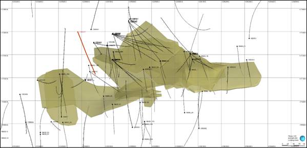 Figure 2: Plan (top-down) view of the previously modelled high-grade domains (gold) used in the 2019 Redmoor MRE, showing CRD037 (red) and other CRL and SWM drillhole traces (black).