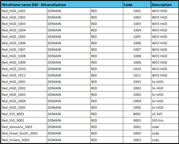 · Mineralisation modelling was conducted in Leapfrog Geo 2025.1. HGDs as described were modelled individually and interpretations were performed on a section by section basis. A 1.5 m nominal minimum width was used and the tungsten HGDs were modelled using geological, structural and grade data. A nominal 0.3% WO3 grade was implemented as a modelling cutoff. A similar technique was used for the tin dominant HGDs, whereby a 0.3% Sn grade was used. The low grade SVS has been modelled in a similar manner, using a 0.3% WO3 Eq grade to ensure all anomalous mineralisation was captured. The medium grade copper dominant domain was modelled using the Indicator modeling technique in Leapfrog Geo and using a 0.3% WO3 Eq cut-off. · Mineralisation models were used as mineralisation domains for estimation and the full list is provided below. A total of 11 tungsten HGDs, 5 tin HGDs, a medium grade SVS domain (8001), a low grade SVS envelope (9001) and 3 tin/copper lodes.