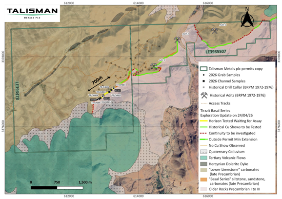 Talisman Metals PLC ("Talisman" or the "Company") reports it has collected 7 channel samples at the Tirzzit Project ("Tirzzit" or the "Project"), for a total length of 23m and 38 Trench samples including 5 QAQC samples and 3 Grab samples which have been sent for assaying.