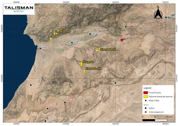 The Tirzzit Project (See Figure 2) is a sediment-hosted stratiform Cu-Ag system, located 225km east of the city of Agadir, Morocco. The acquisition transaction of the Project was announced February 16, 2026 (see press release) from a wholly owned subsidiary of Aya Silver & Gold Inc. (TSX: AYA; OTCQX: AYASF) ("Aya"), the Company's 4.7% shareholder. The Project consists of two mining licenses ("ML's") covering a surface area of 16.5km2. Historic drilling results as reported by Moroccan Government agency Bureau of Research and Mining Participations (BRPM) between 1972 and 1976 ("BRPM Reports"), include drill intersections of 3.16% Cu over 2.5m and 0.60% Cu over 11.4m. Presently the Company is reviewing the extensive BRPM Reports and past collected geophysical data for exploration planning slated to commence in 2H2026. Talisman is processing with Aya the formal transfer of the Tirzzit licences on the back of the acquisition agreement announced February 16, 2026.