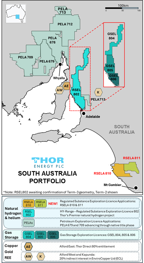 Figure 1: Location of RSELA 810 and RSELA 811 in Thor Energy's South Australian portfolio