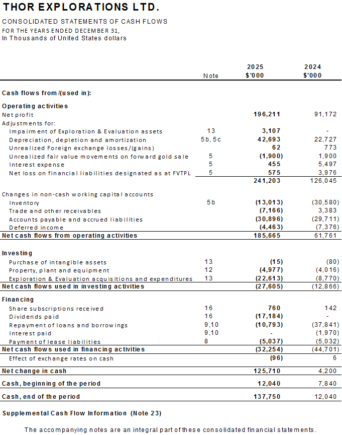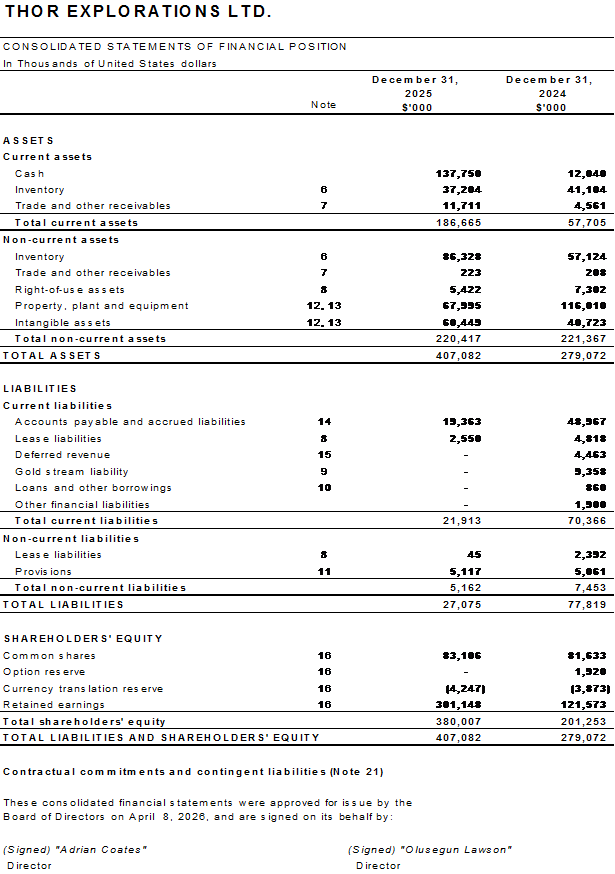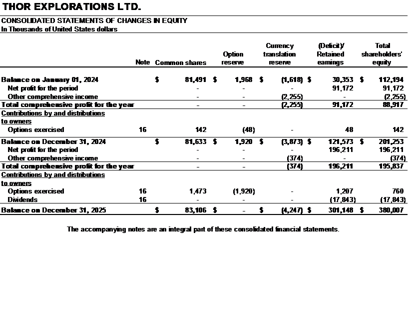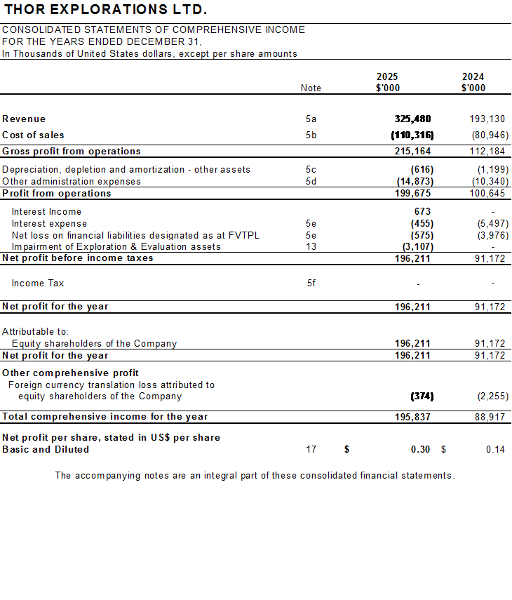 The Company's Consolidated Audited Financial Statements together with the notes related thereto, as well as the Management's Discussion and Analysis for the year ending December 31, 2025, are available on Thor Explorations' website at https://thorexpl.com/investors/financials/.