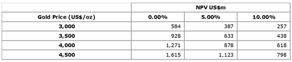 The post-tax NPV sensitivity comparing varying discount rate percentages and gold price is presented in Table 3. The base case result for the Project is highlighted in bold.