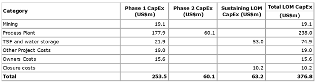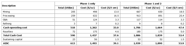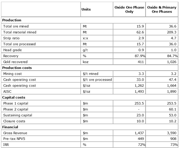 "The Oxide Ore Phase will produce approximately 413koz in the first four years, during which, the project will have an average annual gold production of over 111koz at an AISC of US$1,469/oz in the first three years.