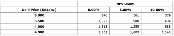 The pre-tax NPV sensitivity comparing varying discount rate percentages and gold price is presented in Table 2. The base case result for the Project is highlighted in bold.
