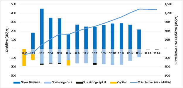 · Strong early cashflow, with gold production of 411koz in the first four years of oxide and transitional ore feed ("Oxide Ore Phase") at an all-in sustaining cost ("AISC") of US$1,493/oz, generating a pre-tax cashflow of US$814 million resulting in US$561 million of net cashflow post repayment of Project capital with an anticipated payback period of 11 months following the start of processing.